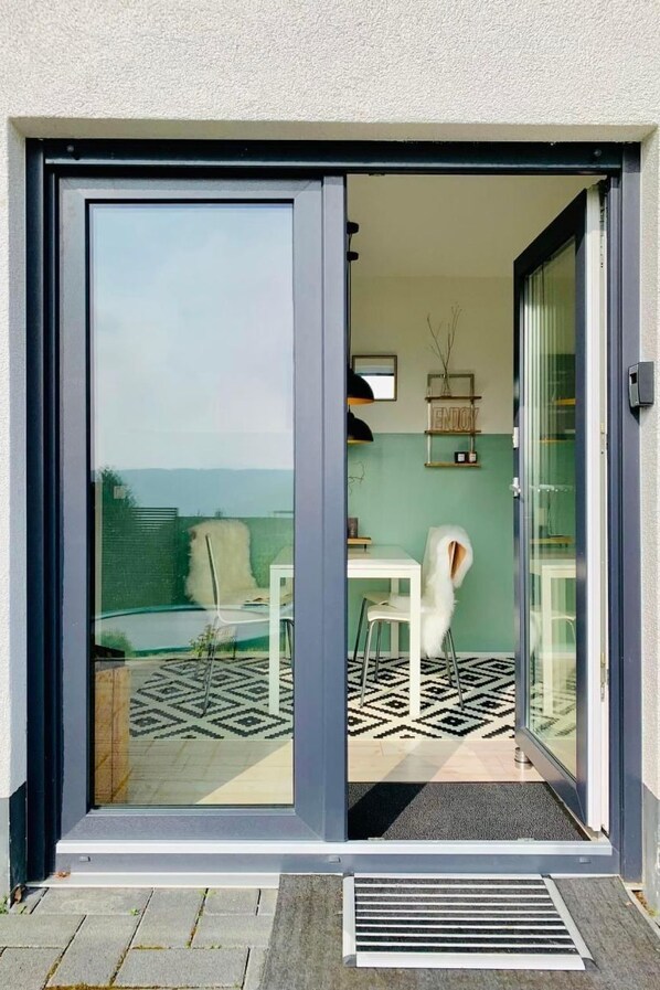 The outdoor area invites you to share a 30m² terrace and a spacious garden. Enjoy sunny hours in the sun lounger area or have fun with your loved ones on the in-house trampoline. This non-smoking flat is part of a modern new build, heated throughout with underfloor heating, and pets are welcome by prior arrangement.