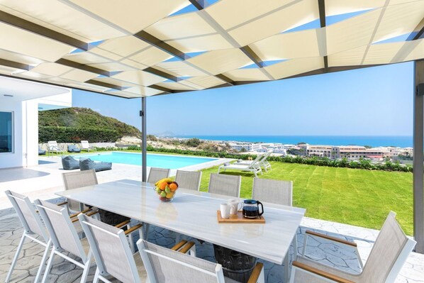 Outside, jump straight into the swimming pool for a refreshing swim or relaxing swim as you look out over the Aegean Sea. When you've finished, step out onto the lush lawn, dry off and choose between traditional or comfortable bean bag style sunbeds. There's plenty of space to soak up the Mediterranean sun on the terrace and patio. The shaded dining area overlooks the pool with fancy lattice chairs, where guests can enjoy a home-cooked meal or fruity cocktail.