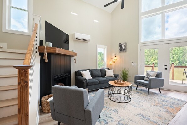 * An open-plan living area with a cozy gas log fireplace, perfect for making memories.