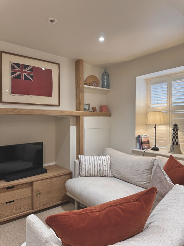 Enter the cottage and you’ll find a useful handcrafted boot storage unit and are welcomed into the open plan living and dining space with engineered wood throughout. The living space provides a sociable atmosphere for you and your fellow guests to unwind, whether you choose to gather around the table or sink into the indulgent sofas in front of the TV or with a book.