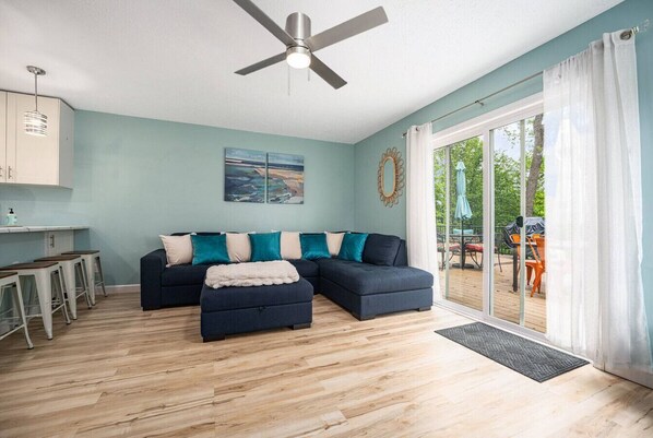 Lakefront apartment with kitchen and balcony