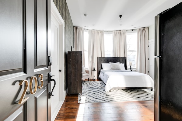 This studio apartment features a private key-pad entry, a fully appointed kitchen with a cocktail-style table + 2 bar stools, completely restored traditional Richmond architecture, neutral tones with touches of color, modern furniture, and an open-plan living area plus spa-like bath and private bedroom retreat.