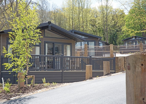 Luxurious lodge with one king-size four poster and one twin, both with contemporary en suite bathroom with bath and separate shower. Stylish well-equipped open plan side aspect living space, modern kitchen and spacious dining area. Patios doors leading to decking – perfect for al fresco dining. Ideal for a luxury break in the region. Pets allowed in selected accommodation only.