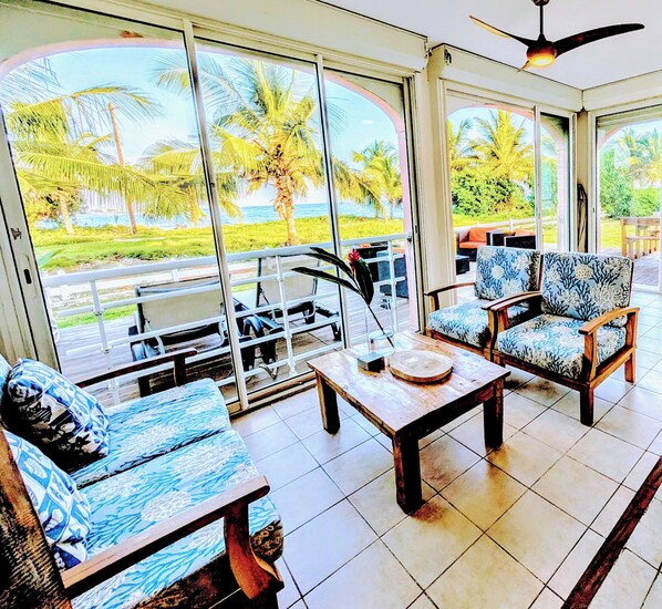Superbe appartement vue mer avec toutes les commodités requises et plus encore. Tout est pensé pour notre confort et on s'y sent bien. Véronika, l'intendante, est disponible et attentionnée. Location sécurisée avec accès à la plage des Raisins clairs via un petit sentier directement de la cour de l'appartement. L'appartement est très grand et bien divisé. Les chambres sur 2 étages permettent à chacun d'avoir son intimité. Les + -Cuisiner et dormir avec une vue mer et au son des vagues -Les multiples accessoires de cuisine ( tout y est ) -Accès à la plage -Cour arrière avec chaises longues -La cafetière Nespresso -La boulangerie à quelques pas ( miam ) -La superette tout à côté avec du vin et du Rhum... et tout pour dépanner -Les 2 piscines -Les 2 espaces de stationnements réservée -À quelques minutes en voiture du centre de St-François Les - -La plage des Raisins clairs est rocailleuse devant l'appartement, pas idéal pour la baignade -Le confort des divans, qui sont en fait des meubles de jardins, mais rien pour gâcher le plaisir de la vue... Ne passez pas à côté...