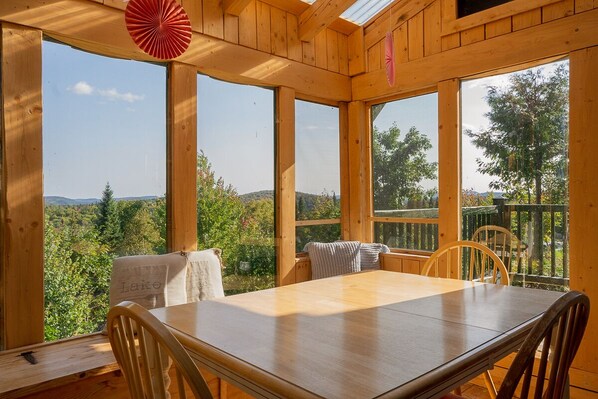Dining - Beautiful rustic chalet with a tower and spectacular view. A spa and veranda open all year round. (Sainte-Lucie-des-Laurentides)
