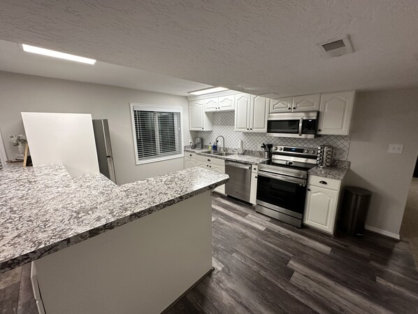 We offer a fully functional and stocked home and kitchen. We try to offer everything you'd need to live here while staying here. The kitchen includes all the needed cookware and appliances to make a great home cooked meal (e.g. spice rack, oven/range, blender, microwave, keurig and drip coffee makers, air fryer, instapot, crock pot, rice cooker, sugar, flour, butter, knife set, serving utensils, etc). All bathrooms are stocked with shampoo, conditioner, and bath soap. Linens and towels are provided. There's a smart TV, high chair, toys and games for all ages, a dedicated work space, and more.