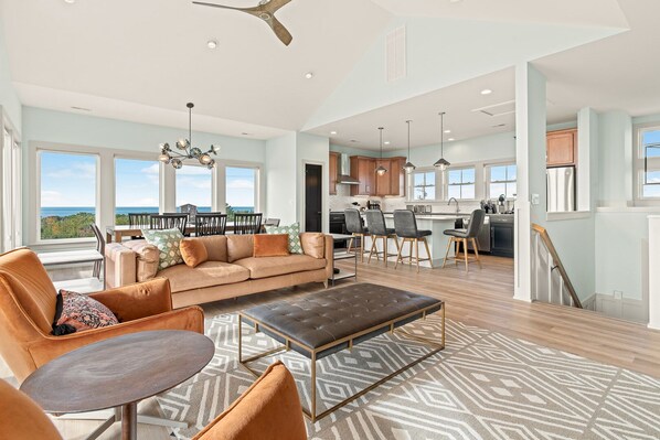The third level of the home is where you will find the living room, kitchen, and dining area, as well as a King En Suite. Tastefully decorated with coastal decor to bring the outdoors inside, you will not have a problem easing into relaxation as you take in the ocean views! There is a half bathroom on this level for convenience.