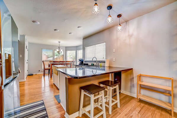 This family-friendly home offers an extensive enclosed backyard with a sparkling outdoor pool surrounded by a safety fence and a paved patio with a picnic table that will be just perfect for alfresco meals! Upon entering, you will first encounter an airy living room that is open to a formal dining area, the kitchen, and an additional seating area. Snuggle up on the large sectional to stream your favorite series or movies on the smart TV, or gather around the coffee table in the second seating area for some board game action. Prepare culinary masterpieces in the remodeled kitchen, featuring all the major appliances (including a smart LG fridge and a Keurig coffee maker) and a convenient breakfast area. Also located on the first floor are one guest bedroom and a laundry room with a washer/dryer. On the second floor are three additional bedrooms plus an attached office with two desks, desk chairs, and monitors.