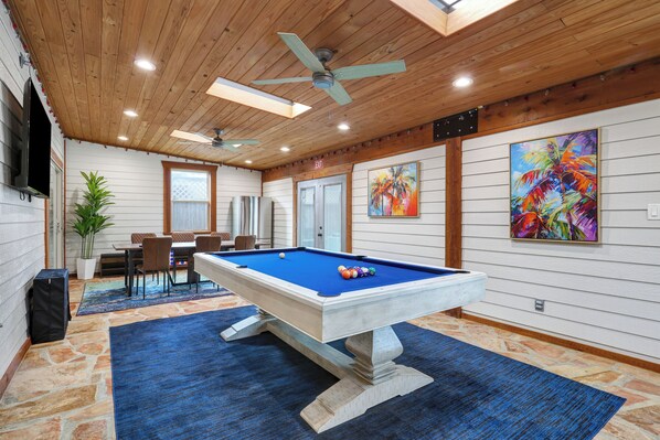 • Game room w/ pool table + air hockey + 65” Roku TV + jukebox