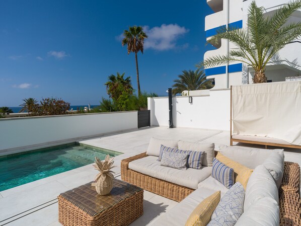 Spacious terrace with a private pool (5.80 x 3.00 x 1.40 m), Balinese bed, sun loungers, outdoor dining area with table and chairs and outdoor sofas for relaxing in the fresh air.