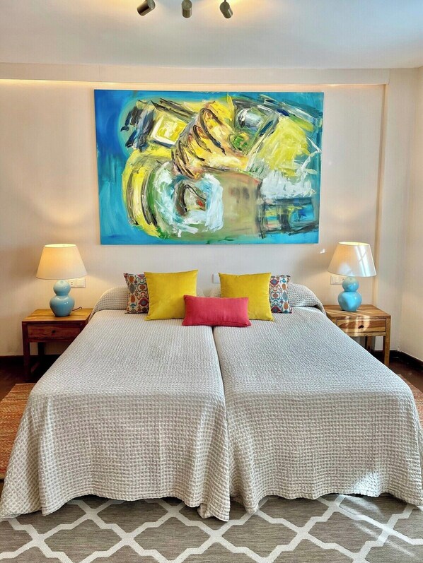 Distributed over 3 floors, this stylish property is ideal for families, couples and business trips, as it has 600mb Wifi fibre internet and spaces for teleworking with a desk. It has capacity for 4 people, with 3 double bedrooms, 3 complete bathrooms and a toilet. The ground floor of the property, from where it is accessed, has a spacious living room with Smart TV and two desks, a beautiful independent kitchen fully equipped with all appliances and a toilet. On the first floor there are two double bedrooms, each with two single beds joined together, the master bedroom has an en-suite bathroom and direct access to one of the terraces of the property. The upper floor has a large and comfortable bedroom with double bed, en-suite bathroom and access to the second cosy terrace, which has armchairs and a parasol where you can relax and unwind.