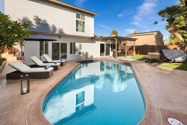 Make lasting memories at this fun and luxurious retreat. Central and close to everything SD has to offer. Large open floor plan, fully renovated and designer furnished in 2024. Huge dining area and 2 large stylish living rooms. Sunbathe, dine and grill outside. Watch movies. Dip in the heated pool or hot tub. Relax by the firepit, or in the cozy courtyard. Enjoy swings and lawn games. Play Air Hockey, Skeeball, Basketball, Foosball, or watch the game on the big screen. This house has it all!