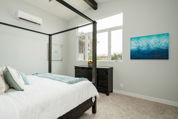 Your ocean view bedroom - The tall ceilings in the spacious and bright master suite upstairs invite you to breathe deeply, relax, and enjoy the great view of the Pacific Ocean. King-size bed, soft sheets, remote control AC/heating unit, and a fan are all there for your ultimate comfort. Plenty of personal storage in the large dresser and two big night stands.