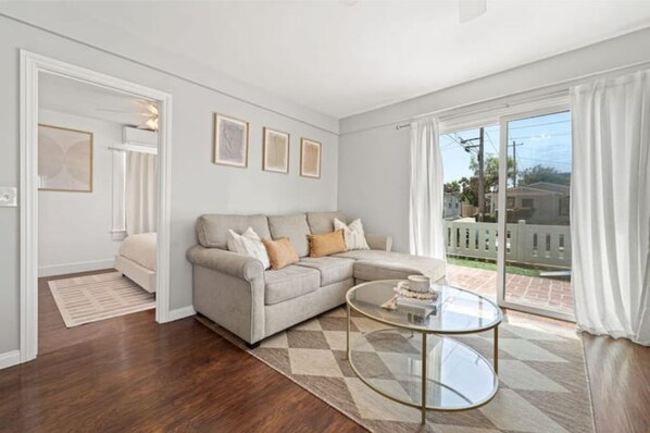 Comfortable home for couples or families! The property is a duplex and you will have full access to the front unit. The unit has 2 bedrooms with queen beds in each, a cozy bathroom with a waterfall shower, charming living room with 50in smart TV and pull out sleeper couch, full kitchen, high speed wifi, AC, and your own front yard equipped with outdoor table & BBQ for enjoying the San Diego sun. Please note the unit's only bathroom is located in the master bedroom so guests will need to walk through the bedroom to use it.