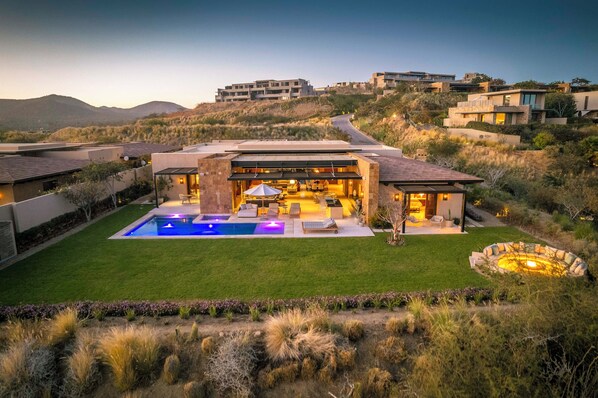 The villa is fully oriented toward elevated indoor–outdoor living. Enjoy a sleek chef’s kitchen, formal dining for 12, multiple ocean-facing lounges, shaded patios, and a complete outdoor kitchen. Spend your days by the heated pool, relax in the Jacuzzi under the stars, or gather around the firepit for sunset cocktails with sweeping Sea of Cortez views.