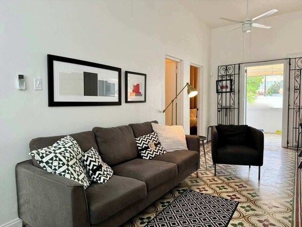 Step into a stylish, mid-century-inspired living space with a comfortable sofa, reading chair, air conditioning throughout, Wi-Fi, and a 50” HDTV. A private guest bathroom is also available with towels and toiletries. The apartment’s original Spanish tile flooring adds a unique touch, creating a warm ambiance.