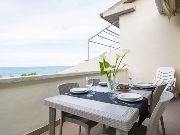 3-room apartment 100 m2 on 1st floor. Spacious, beautiful and tasteful furnishings: entrance hall. Living/sleeping room with 1 sofabed (100 cm), satellite TV (flat screen). Exit to the terrace. 1 double bedroom with satellite TV (flat screen). Exit to the balcony. 1 room with 2 beds. Exit to the balcony. Kitchen (oven, dishwasher, Gas stove, 4 gas rings, toaster, kettle, microwave) with dining table and satellite TV (flat screen). Exit to the veranda. Shower/bidet/WC. Heating (extra). South facing position. Terrace furniture, balcony furniture. Very beautiful view of the sea. Facilities: washing machine. Internet (WiFi, free). Suitable for families. IT049018C29NJTKY4P