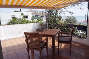 You step straight through the sliding doors onto the sun terrace, where you can enjoy the sea view.