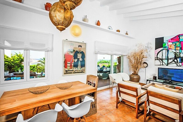Escape to this charming Menorcan villa in Binibeca Vell, offering a calming atmosphere and neutral tones. Unwind on the covered terrace with comfortable seating, overlooking the private pool and Mediterranean Sea views. Enjoy air-conditioned bedrooms for a restful night's sleep.