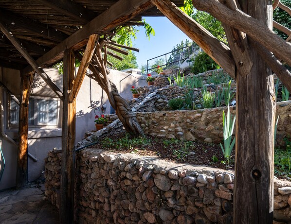 Terraces, levels, and short flights of steps are a hallmark of this property. Enter the blue wooden gate (set into a handsome low stone wall topped with Adobe) from the street and you immediately find yourself in a landscaped patio, stepping up a few feet to a flagstone path flanked by flower beds. Beyond that is the covered front porch, roomy and shaded, with a bench for watching the butterflies and hummingbirds visit the flowering plants.