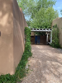 Six blocks from the Historic Santa Fe Plaza, this abode built studio welcomes you to a cozy retreat with solid wood floors and Diamond plastered walls. Unwind in the enclosed courtyard with alfresco dining, BBQ grill access, or relax indoors with a Le Corbusier Lounge chair and flat-screen TV.