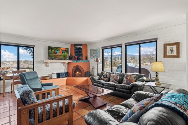 Perched atop a hill, Fort Marcy Unit 8 offers breathtaking views of Santa Fe and the outlying deserts. Step into a cozy living area with an authentic kiva fireplace, comfortable furnishings, and vibrant local art. Enjoy southwestern charm in this spacious condo with private patios & great views ☀️.