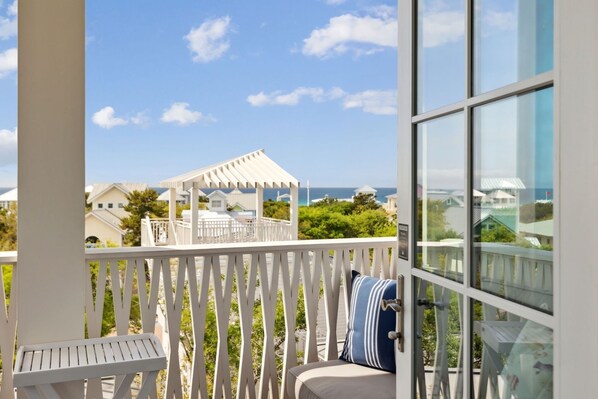 The spiral staircase leads to a third-floor bunk room with 4 beds (2 twins and 2 extra-long twins). The fourth floor features a large desk surrounded by windows and an outdoor lookout tower with unbeatable views of Seaside and the gulf. It is furnished with a comfortable sectional and is the perfect, quiet spot to read a book, take a nap or enjoy sunset cocktails and take in the views and ocean breeze.