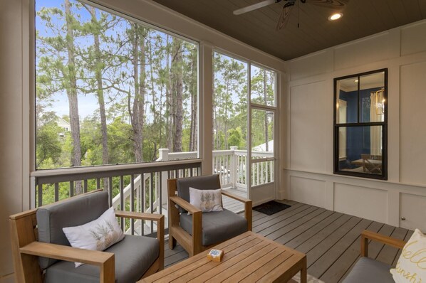 Ascending to the second floor, you’ll find a beautiful and spacious primary wing. It has a king bed with a private bathroom offering a lovely soaking tub and a spacious separate shower. A few steps away is a bedroom-sized walk-in closet with plenty of storage space, which could also fit a pack-and-play or trundle bed. There is also a private large screened-in porch which is an excellent place for morning coffee or watching the sunset. This wing can be closed off to create plenty of privacy from the rest of the house if desired. Down the hall is a second guest bedroom with a queen bed and walk-in closet. The third guest bedroom has 2 twin-over-full bunk beds. This is a large room with plenty of space for multiple people with a walk-in closet. Next to this bedroom is a “hang out†space with bean bag chairs, board games, and a smart TV with gaming capabilities creating a space for everyone. Both guest bedrooms share a hall bathroom with a tub and shower, along with two separate sinks.