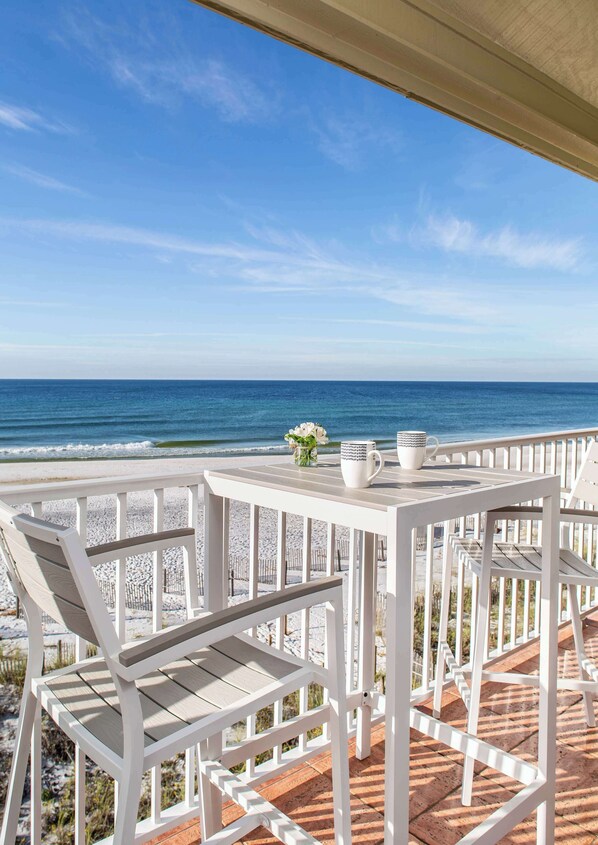 Love this location right on the beach! Beach area not crowded, close enough to bike to Seaside. Condo was very cute - beach decor was well done. It is a third floor level with vaulted ceilings making it feel very spacious. Furniture etc in very good condition. We have stayed many condos in this area and this one is my favorite!