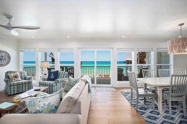 As you enter the open kitchen, dining, and living areas, you'll be greeted by panoramic beach views through floor-to-ceiling windows and a sliding glass door that leads to the spacious balcony. You can enjoy the views from the balcony or take the stairs directly to the sand and your private beach, complete with four chairs and two umbrellas set up for your sunbathing pleasure each morning (March-October).