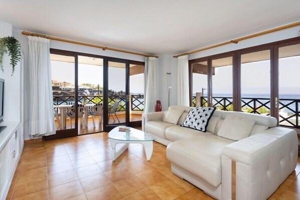 Cozy Apartment front beach, with community pool.Large Terrace with tables, chairs and sun loungers.Two bedrooms with double bed, One with two single beds.Living room with sofa , flat TV, Wifi, fully equipped kitchen and two bathrooms.Washing machine and drying rack.