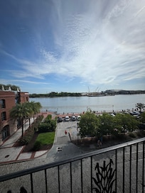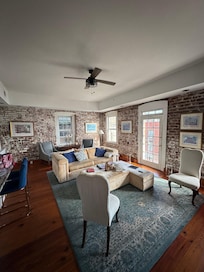 In Savannah's vibrant River District, the Bay Street Flat offers a timeless retreat amidst luxurious condos. Discover fresh updates accentuated by charming exposed brick and elevated ceilings in this 2-bed, 2-bath flat. Relax on the private balcony with captivating views of the Savannah riverfront or unwind in the living room on comfortable furniture while enjoying entertainment on a smart TV.