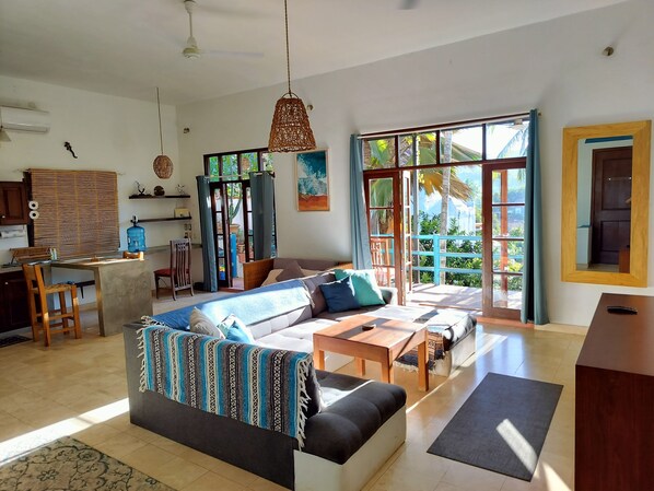 Nestled in a jungle setting, this spacious modern home boasts an incredible balcony with stunning views. Unwind on the cozy sofa in front of a 90-inch TV or prepare meals with ease using the fully equipped open kitchen.