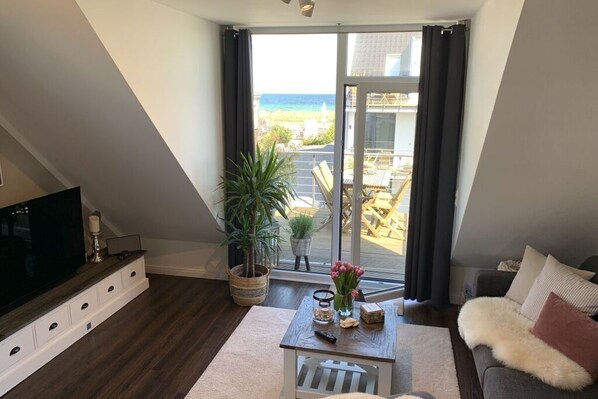 Beach Participation Nordstern is a light-filled apartment with Baltic Sea views, fresh sea breeze, and an unbeatable location on Beach Allee in Haffkrug. Unwind on one of the two sunny balconies or take a few steps to the kilometer-long sandy beach. Enjoy your private beach chair during summer season from mid-May to September.