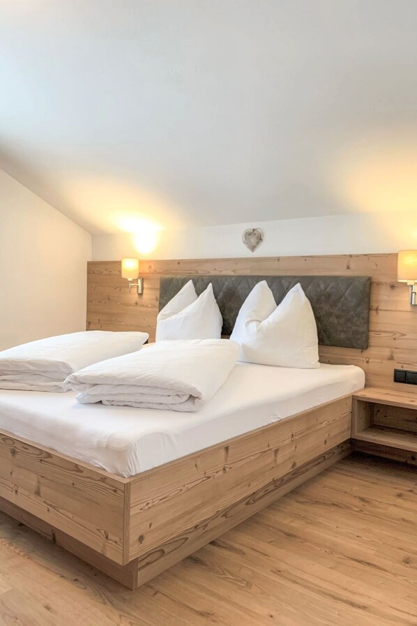 "Neuner", 4-room apartment 70 m2 on 2nd floor. Practical furnishings: 1 room with 1 bed, 1 double bed and satellite TV. Exit to the balcony. 2 rooms, each room with 1 double bed and satellite TV. Exit to the balcony. Kitchen-/living room (4 hot plates, oven, dishwasher, kettle, electric coffee machine) with dining nook and satellite TV. Exit to the balcony. Shower, sep. WC. Heating. Balcony. Facilities: baby cot. Internet (WiFi, free). E-charging station. Maximum 1 pet/ dog allowed. Slight pitch. Bed layout is flexible. There are more sleeping options available than the maximum number of people allowed which may, however, not be exceeded.