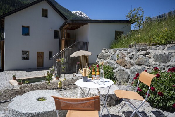 Modern comfort in a historic building! The charmingly renovated 1-room apartment in the former mill of the Engadin mountain village of Ardez is one of a kind. Located about a 10-minute walk from the village center of Ardez, the house stands alone in absolute tranquility. Enjoy your most beautiful time of the year – your vacation in Ardez, a typical Engadin location, surrounded by sgraffito-decorated houses, the Swiss National Park, and a ski, family, and hiking offering that is unparalleled. In the same house, there is also a 4.5-room vacation apartment and a 1.5-room vacation apartment. The three apartments can also be rented together, an ideal option for larger families and multi-generational vacations. The owner lives in the 4th apartment.