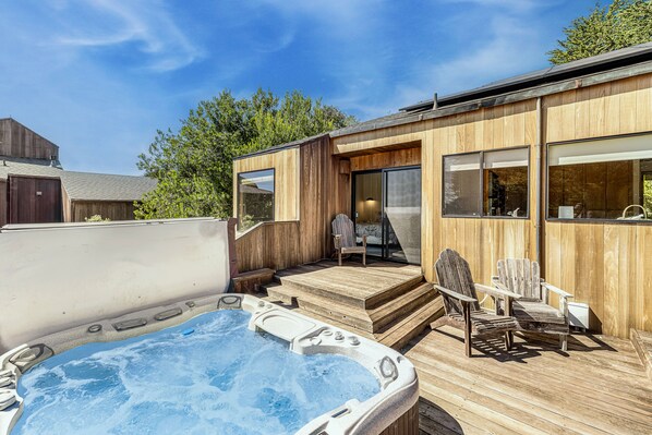 Urban Escape Compound, nestled in the Sea Ranch community, offers a tranquil retreat with south-facing ocean views and two private hot tubs. Soak up the sunshine in the wind-protected courtyard or watch for whale spouts from the deck while grilling your favorite meal.