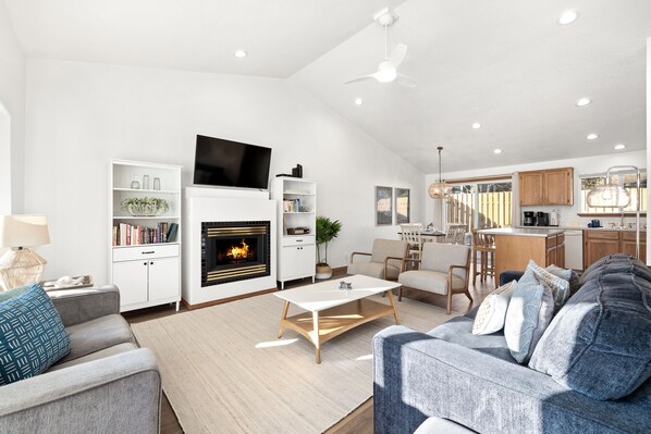 The evening hours are best spent watching Netflix and DVDs by the gas fireplace, playing board games at the table, and sharing photos over the high-speed WiFi. Of the bedrooms, one is a primary suite with its own desk and private bathroom.