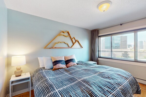 This chic and modern condo on the 14th floor invites you to experience Seattle as if you're among the buildings and clouds themselves. Enjoy the phenomenal views of Pike Place Market and the gardens surrounding the Convention Center. Comfortable furniture with Pacific Northwest touches makes this condo feel like home and the living room sits next to the kitchen and eating area so no one is left out of the fun. Watch your favorite cooking show on the flat-screen Smart TV with streaming services then head to the market for ingredients within walking distance of the condo. The kitchen comes fully equipped with all the essentials to surprise your guests (and even yourself) including an electric cooktop, stainless steel appliances, and ample utensils. With free WiFi, you can check in at work if you have to or search for the hippest restaurants or sites nearby. With enough seating in the living room, everyone can gather and talk about the day or retire to one of the two bedrooms with additional beautiful views. Speaking of views, don't forget to take advantage of the shared rooftop deck for that tasty evening cocktail!