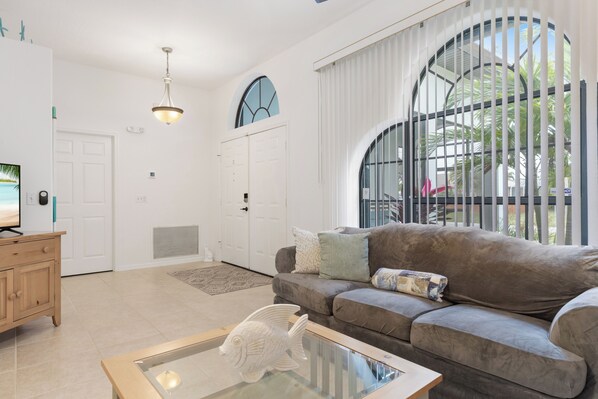 This spacious 3 bed , 2.5 bath home features a heated pool, loungers, and a poolside bathroom. The covered porch has exterior furniture perfect to dine or relax. The King Master Suite offers a private en-suite shower, while two additional Queen Bedrooms share a bathroom. The open kitchen and two living areas are a retreat for couples or multi-family stays. Each room has a Smart TV. Located in a quiet neighborhood with sidewalks. Beach chairs are in the garage. Mins to the beach and river!