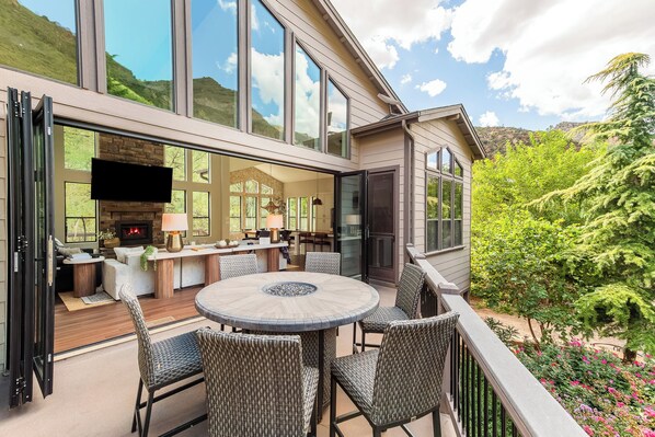 Be amazed by some of the best views in Sedona! Our modern-style home, undergoing a full remodel in 2025, is nestled in the exclusive Oak Creek Canyon on a quiet street surrounded by red rock and nature. This 3-bedroom, 2.5-bath retreat sleeps up to 10 guests and features spacious interiors and a brand-new outdoor entertainment area with a hot tub, fireplaces, a BBQ, and more. Located along the Oak Creek River — which you’ll cross as you enter the neighborhood. Luxury with a View! The main level includes the garage, laundry room, and the 2nd and 3rd bedrooms, which share a full bathroom with a shower. Upstairs, you’ll find the expansive main living area and master bedroom (king), which features two vanities, a free standing bathtub, and walk in shower. The huge living space is perfect for large groups and families, with an oversized gourmet kitchen, a large center island ideal for cooking together, and a dining table that seats eight. The living room features a gas fireplace and a massive 100” TV for enjoying your favorite shows and movies. Also on the upper level are two full-size pull-out sofa chairs for additional sleeping space. Outside, the front deck includes a propane fire table with seating for six, while a large covered patio in the back offers even more space to relax and gather. Brand new outdoor entertainment area with bbq island, fireplace, fire pits, hot tub, stereo, and plenty of seating