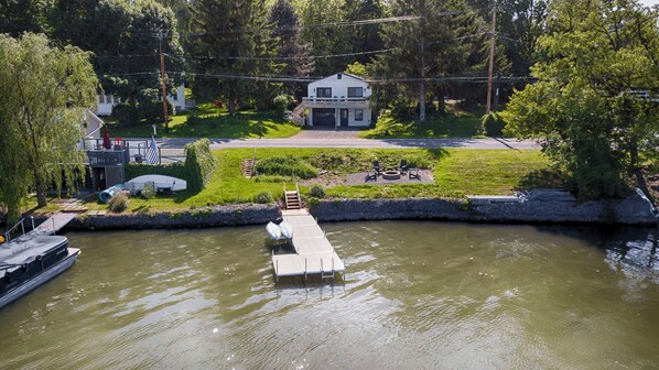 Step outside to enjoy the best of lakeside living. The home's private waterfront, located across quiet Lower Lake Road, features a natural shoreline perfect for swimming and kayaking. A dock extends over the clear water, providing the ideal spot for fishing, sunbathing, or simply relaxing with a glass of local wine.