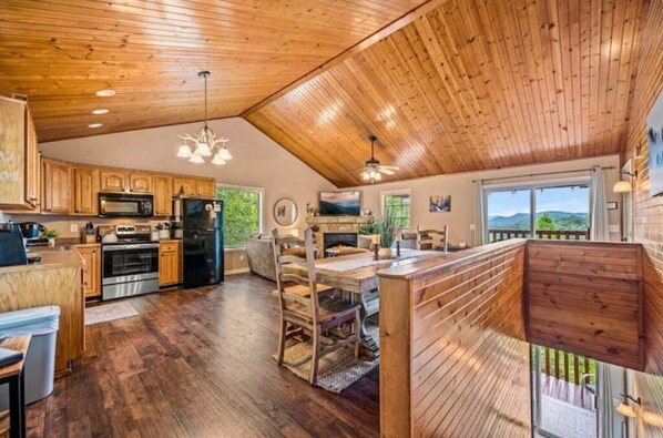 KEY FEATURES: ☀ Large, 2-story cabin with over 2,000 sq ft of space to enjoy and stretch out ☀ 3 bedrooms with 3 king beds and additional twin bunk bed - sleep up to 8 ☀ 2 bathrooms one on each level - shower/tub and double sinks. Jacuzzi in master ☀ Open-concept kitchen, dining + living room with cathedral ceiling ☀ Large dining table with seating for 8 people ☀ Fully-stocked kitchen ☀ Game Room/Den for Kids and Adults with foosball table, Retro video arcade with multiple games, toys, books, board games, TV-DVD player ☀ Large flat-screen TVs throughout cabin in every room with satellite TV ☀ Wifi ☀ 2 large decks w/ breathtaking views ☀ Outdoor seating, outdoor porch bed swing, hot tub ☀ Electric Blackstone griddle ☀ Free stackable washer + dryer in the cabin ☀ Air conditioning, central heating + indoor fireplace (seasonal) ☀ Free parking on the driveway for up to 3 cars ☀ Part of a private, gated community ☀ 180º views of the mountains + forest☀️