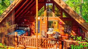 Escape to Love Song cabin in the heart of the Smoky Mountains, where a peaceful, private setting and luxurious amenities await. Cozy up by the fireplace or unwind in your private hot tub overlooking the serene forest, with a queen bed and jetted tub inside for ultimate relaxation.