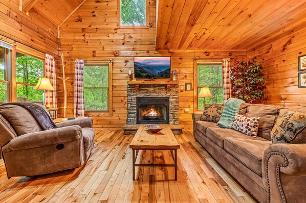 Wraparound Porch: Rocking chairs, scenic woodland views, and peaceful vibes await.