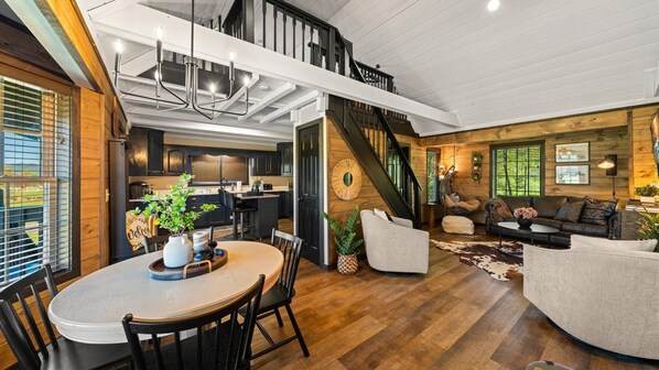 Reconnect in this newly renovated, rustic modern cabin with a romantic loft, creek side hot tub, and amazing views. Enjoy community pickleball, basketball, playground, mini-golf, fishing, and firepit. Experience nearby Pigeon Forge, Gatlinburg, and GSMNP. Relax in the hammock, play retro arcade games, while the babbling creek whispers in your ear. Grill on the back porch. Recharge in the bright living area with WiFi and smart tv. Adventure in nearby hiking trails and amazing waterfalls. Enjoy the community pond where geese visit or roast marshmallows at the firepit.