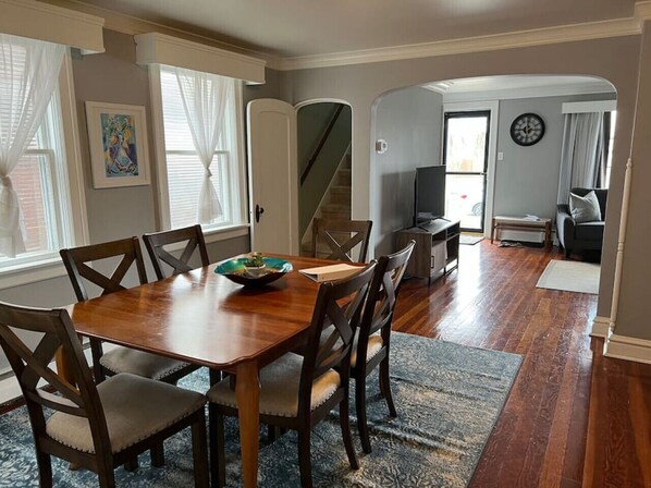 This rental is a three bedroom home with private parking in the back and a fenced-in back yard! A queen size and full size bed are located on the second floor, while a twin size bed is conveniently located on the first floor. Both bedrooms on the second floor are equipped with ample closet space, and dressers for your convenience. There are two fully stocked bathrooms located in the home; a half bath on the first level and a full bathroom located on the second floor. We also have a Washer and Dyer available for you to use as needed! Additionally, enjoy a comfy living room, beautiful dinning room, and spacious kitchen, stocked with all the cooking basics for you to use at your leisure.