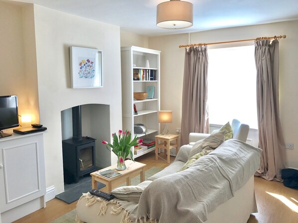 The cottage is comfortable and well equipped. The ground floor consists of a sitting room with wood burning stove, furnished with a comfortable 3 seater sofa and an armchair. There is television (with internet freeview channels and apps) and free wifi; a DVD player with a selection of movies, and a bookcase with plenty of books to read. There is also a welcome folder with maps and information about local attractions.