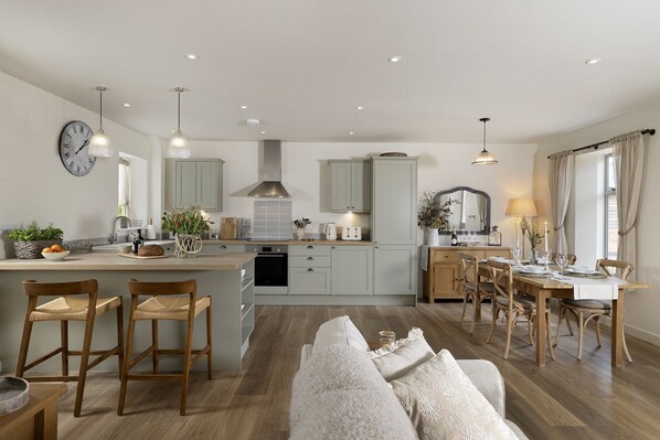 Electric oven and hob, microwave, cafetière, toaster, kettle, fridge/freezer, breakfast bar, three-seater sofa, two-seater sofa, Freeview TV with Amazon Fire Stick (account holders only), games, books and dining table with four chairs