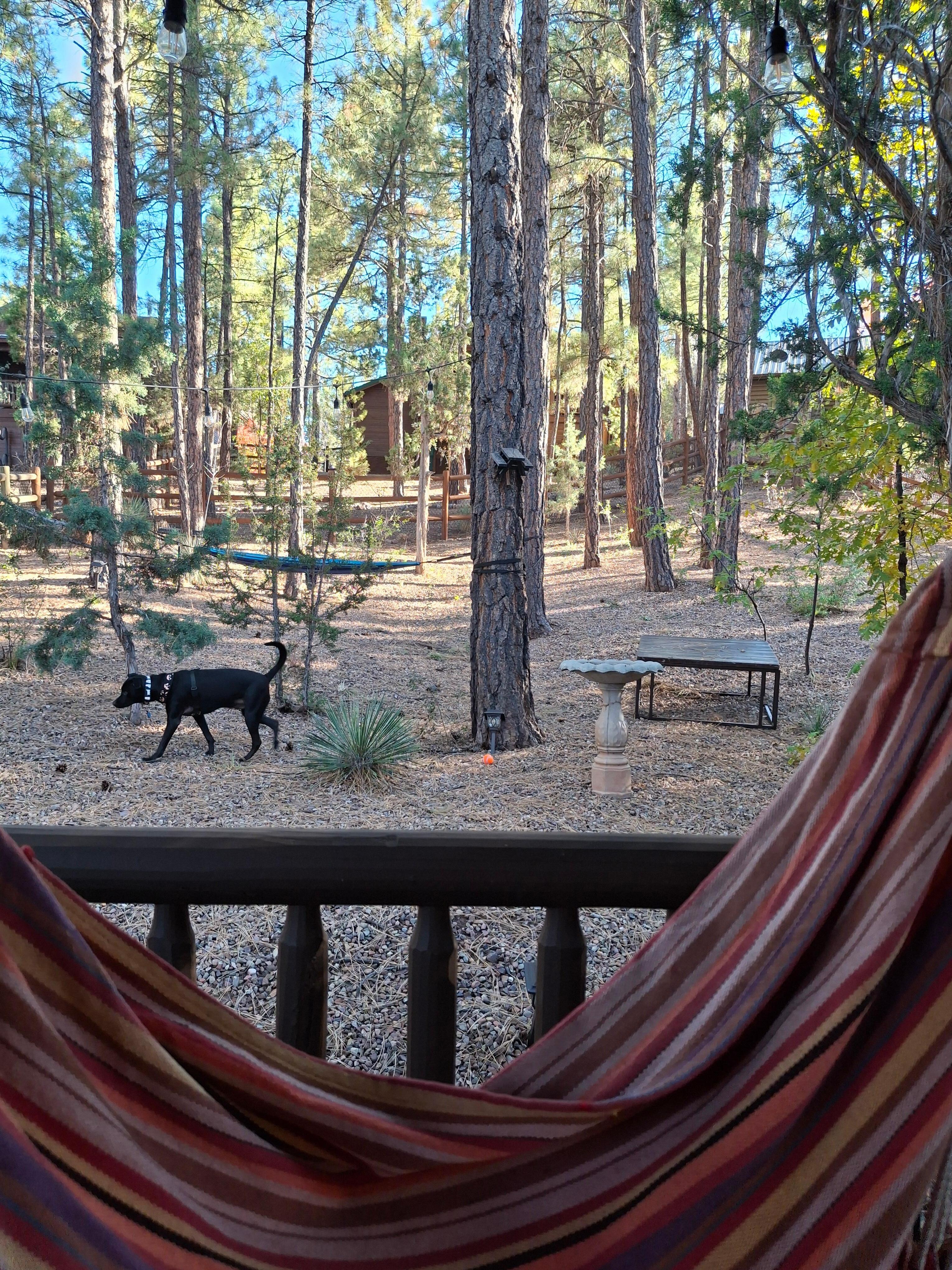 We slept in the room woth the king soze bed and it was super comfortable! We brought pur two dogs with us. They loved the free range back yard. They had the time of thoer lives. There are lots of.dog friendly restaurants in Showlow/Pinetop of you need suggestions. This cabin would be fine for 2 couples staying togeter or a small family. They have hammocks and hammock chairs in the backyard. The yard is very spacious. There is plently of seating isndie. It was very clean and comfortable